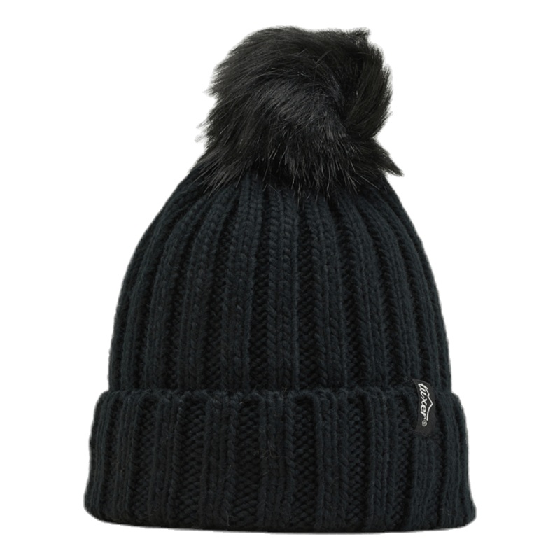 Snygg ribbstickad mssa med en imiterad luggkula ovanp.