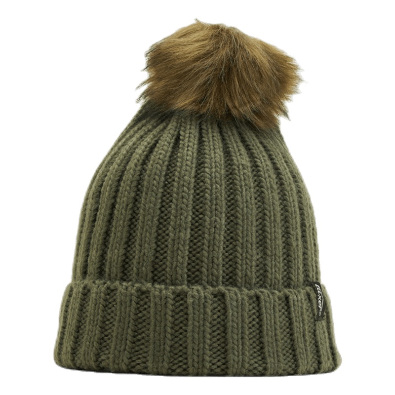 Snygg ribbstickad mssa med en imiterad luggkula ovanp.