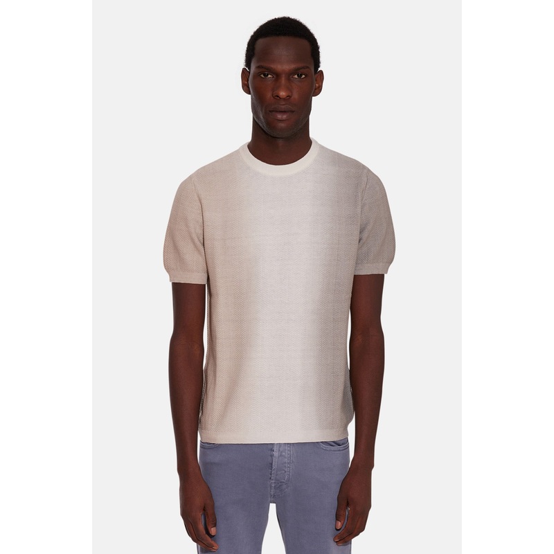 - Color: Beige- Crewneck jumper- Vertical degrad beige, grey and white cotton and linen knit- Chevron knit- Short sleeves-Ribbed trims- Logo patch on the back- Made in Italy- 54% linen, 46% cotton- Dry clean using reduced cycle- Iron max 110C on reverse- D