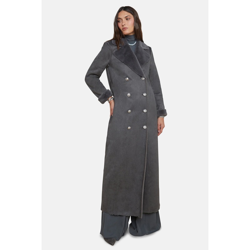 A classic silhouette cut from luxurious vegan shearling, offering full-length warmth.Vegan ShearlingFully linedDouble breasted styleEmbossed dome button closureBack Vent100% PolyesterCare: Machine wash cold separately gentle cycle, Do not bleach, Line dry,