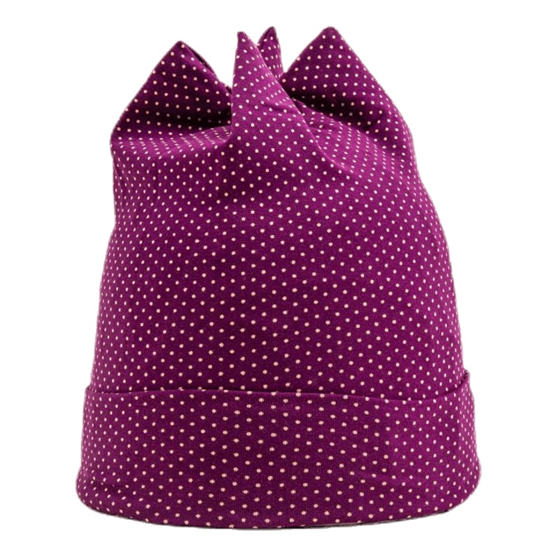 Lila prickig luva i jersey. Smmarna p toppen av luvan ger en rolig effekt. Materialet r ekologisk bomull/elastan och r Oeko-Tex certifierat.