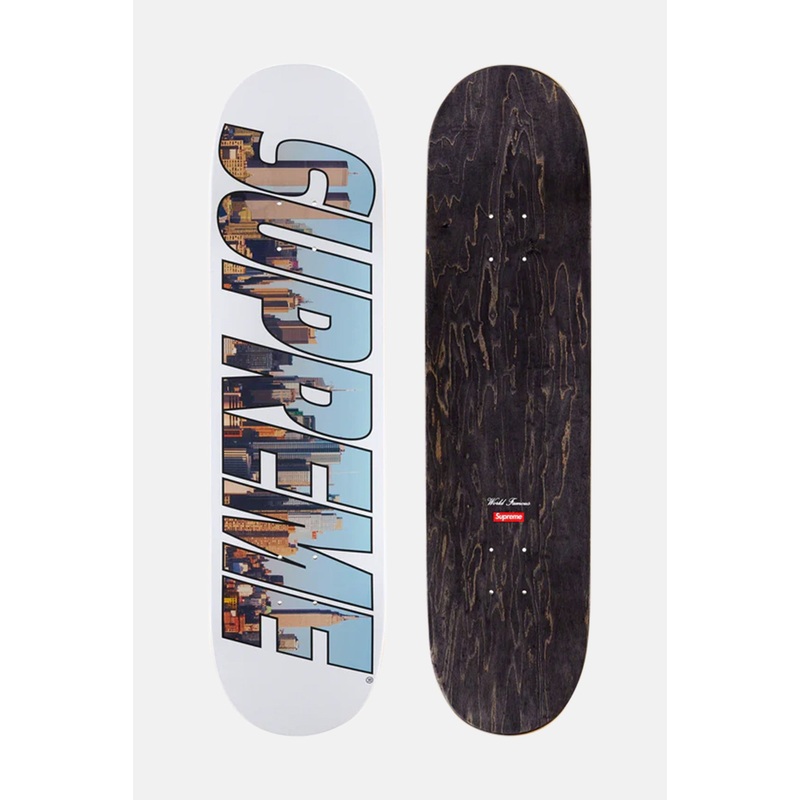 Supreme skate deck with natural veneer and black top plywood. Printed Gotham logo on bottom with printed World Famous and box logo on top.- Color:White- FW23- Release Date: 8/17/23