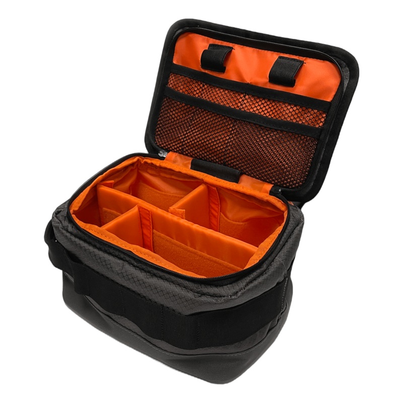 Frvara din pannlampa och Silva-utrustning i denna skyddande och slitstarka frvaringsvska, vadderad med skum, och med ntfickor fr batterier och tillbehr. Frvaringsvskan r mrkgr med orange foder, tillverkad av slitstark nylon och vadderad med skum fr att sky