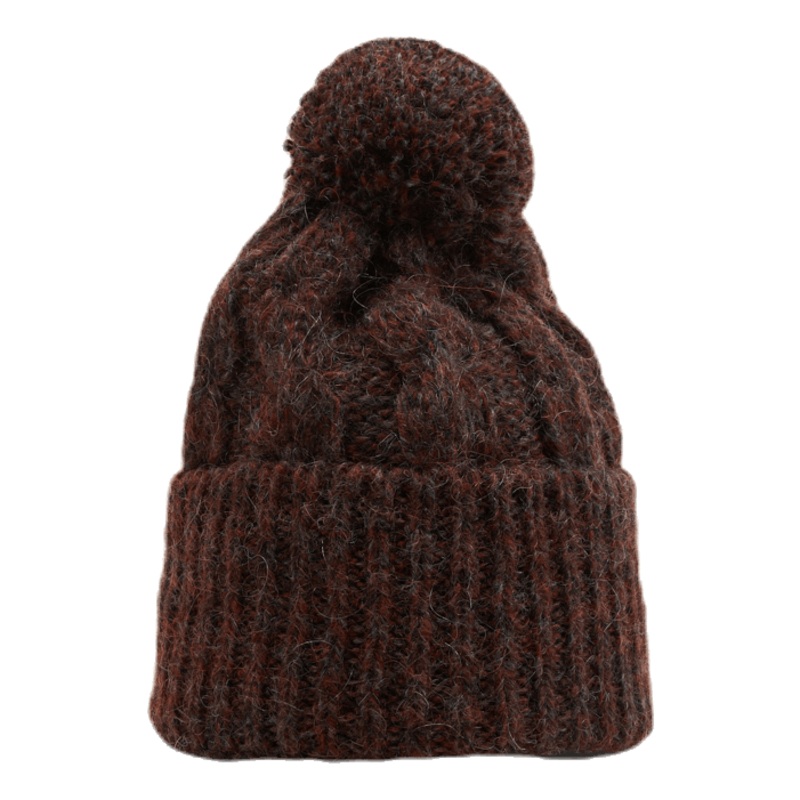 Hlle r en mjuk fltstickad mssa med stor boll och ett lite hgre uppvik i ett melerat garn med mohair. Hlle har en dragtopp vilket minimerar garnspill som vrnar om miljn.