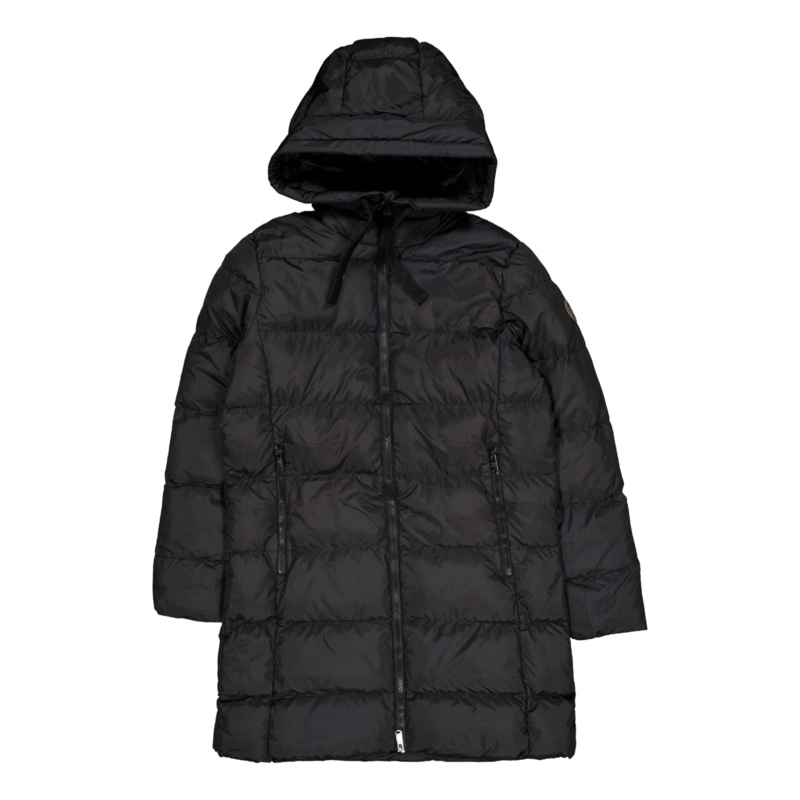 Lng varm vinterjacka, med feminina detaljer. Tvvgsdragkedja och slits i sidsmmen fr extra rrelse. Huva med avtagbar pls. 100 % polyester