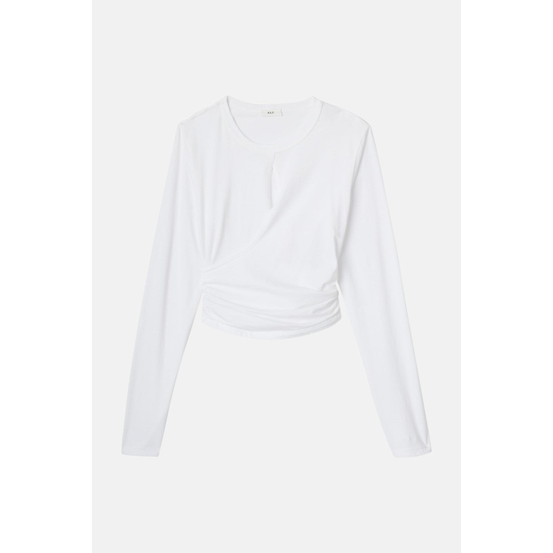 - 100% cotton - Made in USA - Machine wash - Surplice front with cut-out - Lightly ruched sides - Lightweight jersey fabric