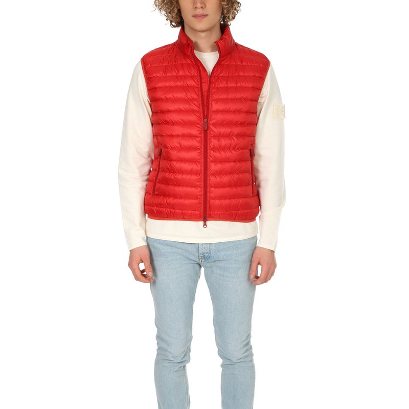 Vest in extra-light, mini rip-stop waterproof nylon, with front zip closure. Horizontal padding, vertical pockets with zippers. Hem and armhole edged in Lycra. - Color: Red - 100% Polyester - Filling: 90% Down 10% Feather- Style #: I313E04185305- Made in I