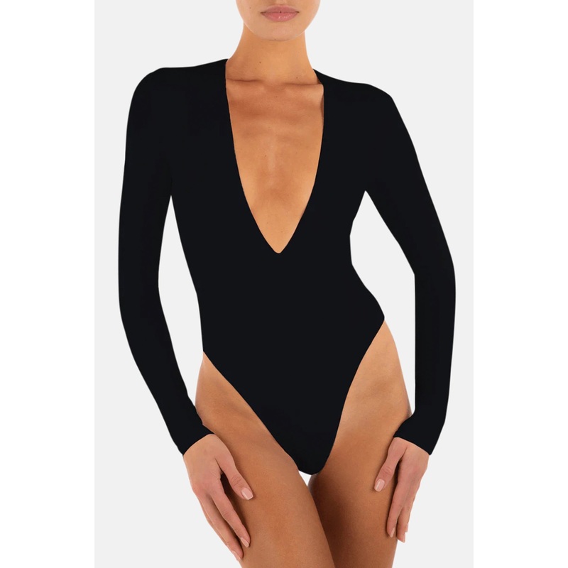 Cut from a double-layered modal blend, our long sleeve deep v bodysuit features a close fit for a figure-hugging silhouette along with its snapless thong design for comfort and an undetectable finish under your clothes.- Color: Black- Fit: figure-hugging-