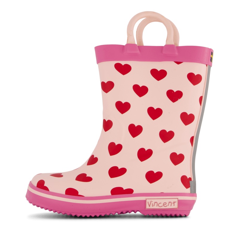 Detta par gummistvlar har en rosa frg, rosa hjrtan och ett yttermaterial av gummi. Klackhjden r 3 3/4 tum hg. Denna stil r avslappnad och toppkategorin r skor.