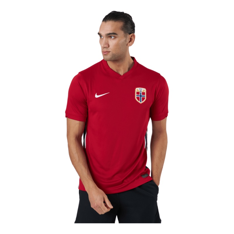 Norway Stadium Hemma herrar: avslappnad stil, norsk fotbollstrja med Nike-logotyp och norska fotbollslandslagets vapen