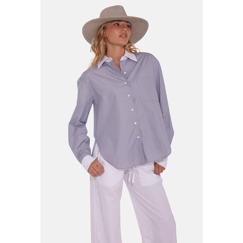 A Fine Poplin cotton shirt featuring a luxe body silhouette, crafted with a spread collar and delicate front pocket detailing. This versatile garment pairs seamlessly with jeans for a casual-chic look, or with cargo trousers for a touch of utility-inspired