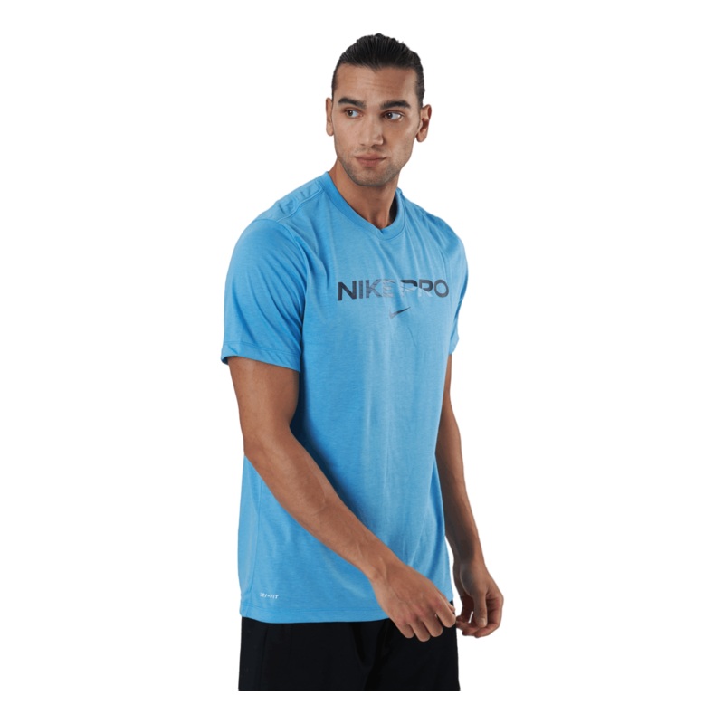 Trna i Nike-utrustning. Nike Pro Tee i bltt r en sportklder fr mn som anvnder funktionella t-shirts, avslappnad stil.