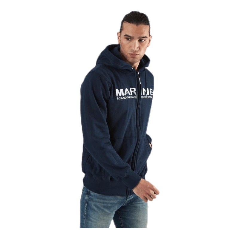 En snygg luvtrja med en marininspirerad look. Modellen har hel dragkedja sajusterband i huva samt stilrent tryck p brstet.